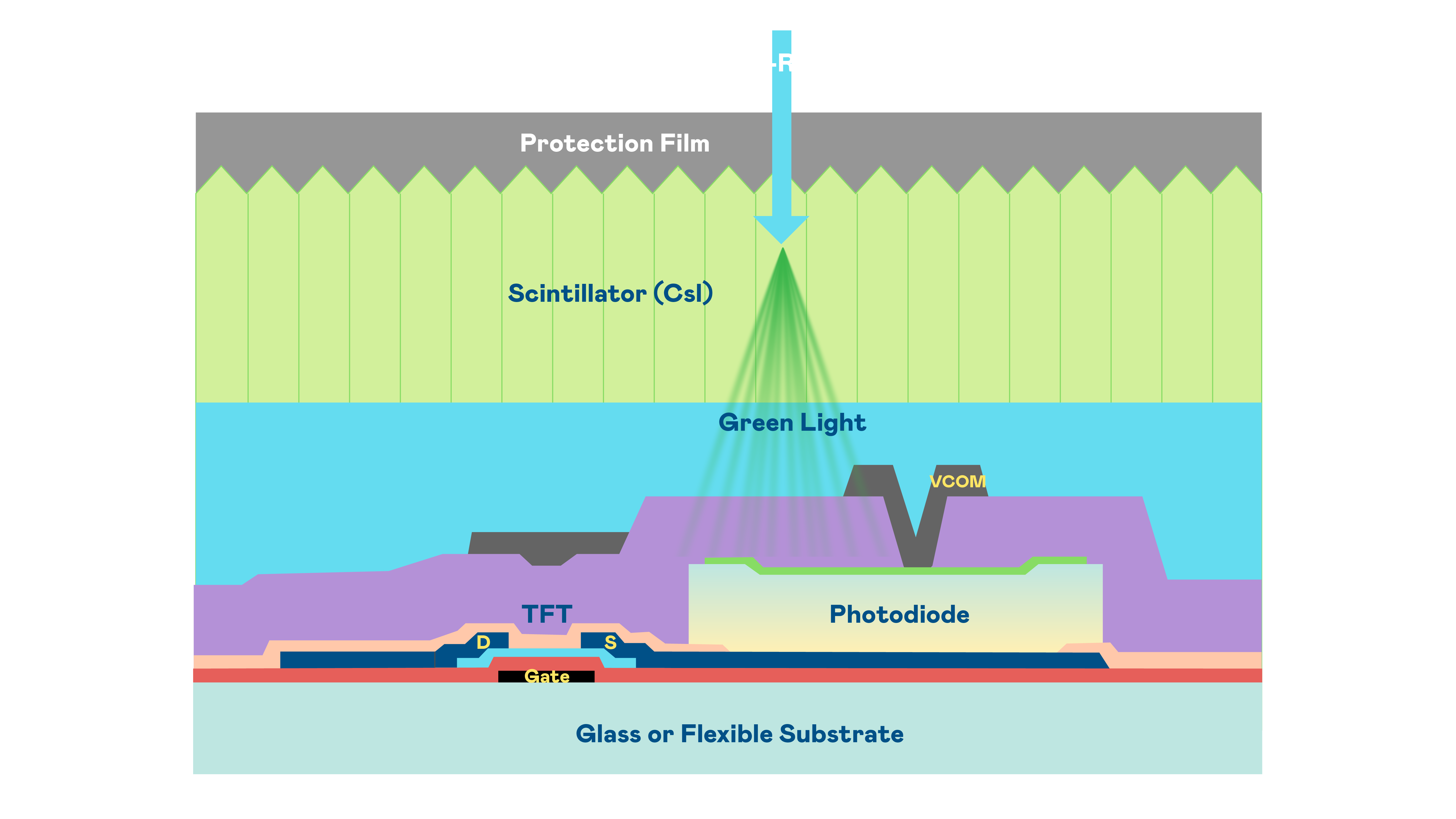 九游会ag的X光影像感测阵列使用薄膜电晶体 (TFT) 作为每个像素的读取开关,搭配光电二极体(Photodiode)的光电转换元件,用以感测X光影像讯号。
